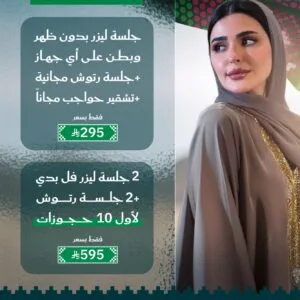 جلسة ليزر بدون ظهر وبطن على أي جهاز +جلسة رتوش مجانية +تشقير حواجب مجاناً (295 ريال سعودي)